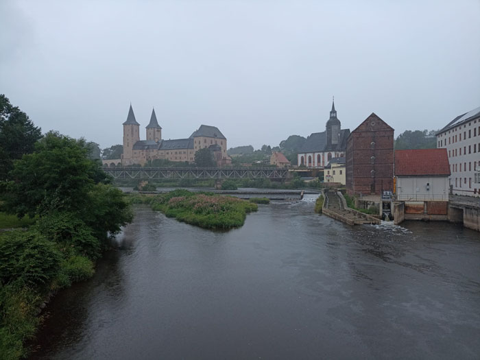 Der Donnerstag brachte uns die längste Etappe mit 70 km, die ab der Mittagszeit wieder einlud, den Regen zu „genießen“, kurz nachdem wir die thüringische Landesgrenze passiert hatten. Über Langleuba-Oberhain ging es weiter Richtung Wechselburg. Gerne hätten wir dort noch etwas ausgiebiger verweilt. Aber der starke Regen trieb uns an, die Fahrt fortzusetzen, um die Strecke möglichst schnell hinter uns zu bringen. Weiter ging es über Rochlitz nach Kralapp und dort aus dem Tal der Zwickauer Mulde heraus nach Geringswalde und schließlich zu unserem Etappenziel nach Hartha. Aufgrund der Erfahrungen der Vortage wussten wir, was uns erwartet: wieder so unbeschreiblich herzliche Gastfreundschaft.